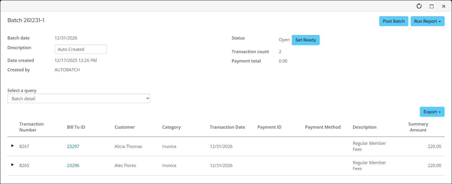 Note: Although the membership fee batch for individuals renewals does not need to be posted, the accounting batch that the invoices are added to does require posting. See Posting batches for details.