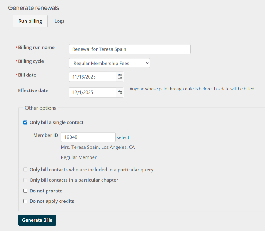 Note: When using the Generate renewals link from a member’s account page, the Only bill a single contact checkbox cannot be disabled.