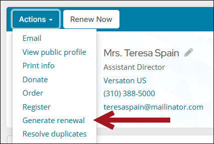 Out-of-the-box, the Generate renewal link is located on all member profile pages that only authorized staff users can see from the Actions button.