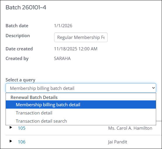 - From the Select a query drop-down, select one of the following queries to review additional information about the batch transactions: