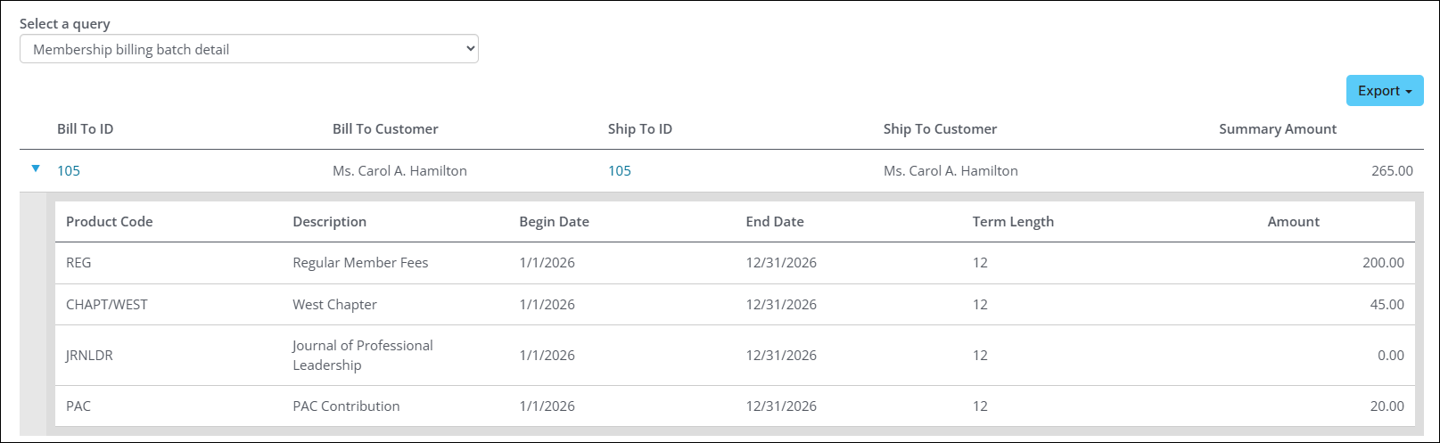 - Membership billing batch detail - Displays renewal transaction details for a selected batch, such as the bill to ID and customer, ship to ID and customer, and the summary amount. Expanding the row provides the individual billing products associated with the transaction, including the product code and description, term begin, end, and length, and amount per product.