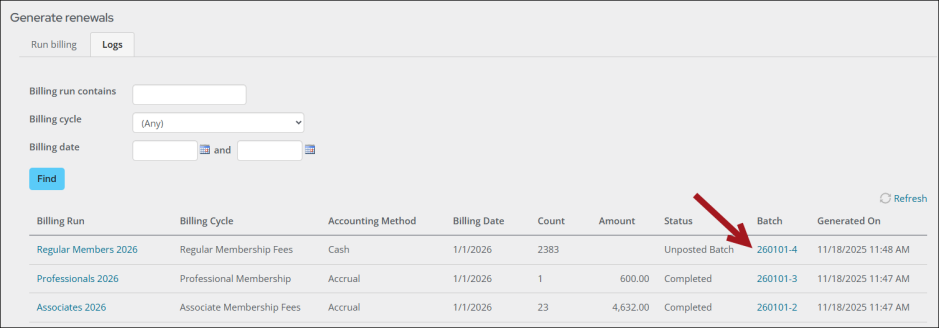 - Locate the billing run, then select the Batch link.