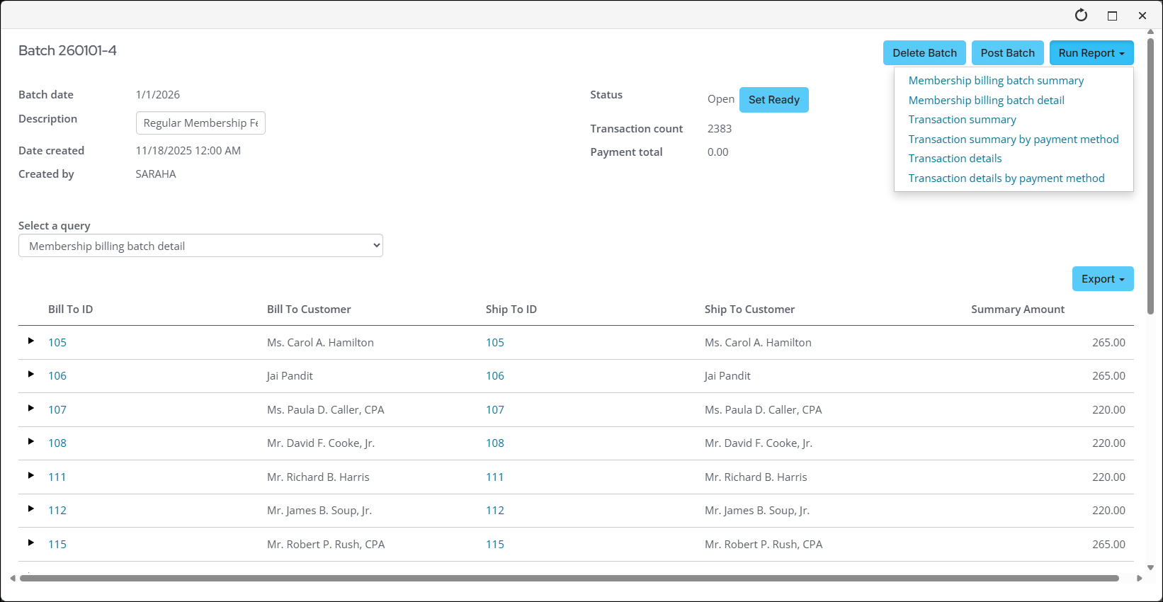 After you have generated a mass dues billing, you need to review and post the batch.