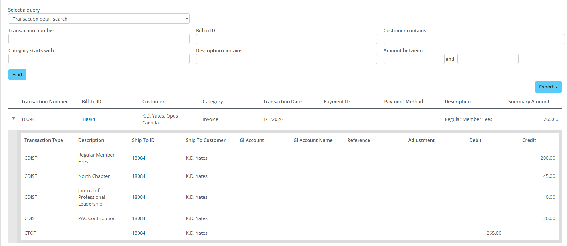 - Transaction detail search – Displays the details as the Transaction detail query but offers users the option to search for a transaction by the transaction number, bill to ID, customer name, category, description, or amount.