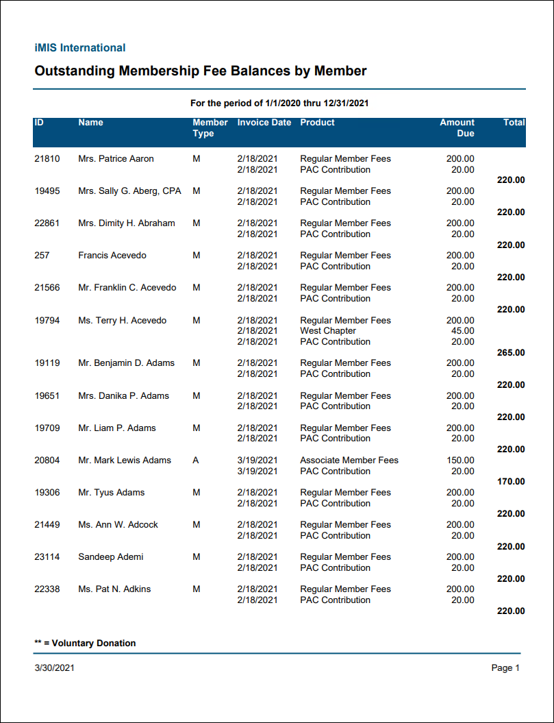 Default invoice report, intended for use with Membership (DUES) and Fundraising (FR) invoices. Displays invoice details without any special formatting for events, orders, or taxation. Can be filtered by invoice date, invoice number, bill to contact, or open balance amount.