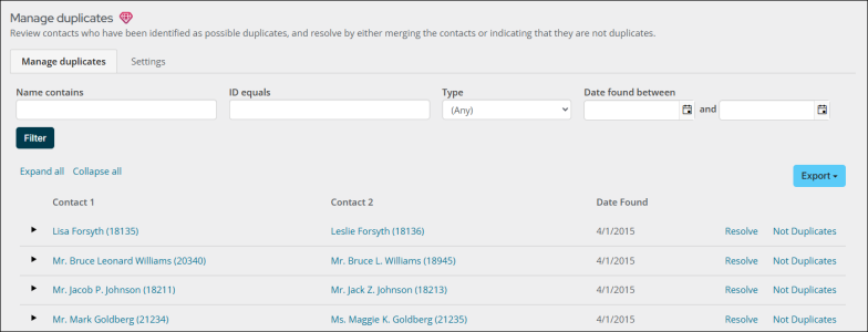 | Premium — Review all potential duplicate record pairs. Determine which records to retain, which records to merge into the retained records, and which records to mark as Not Duplicates. | + | |