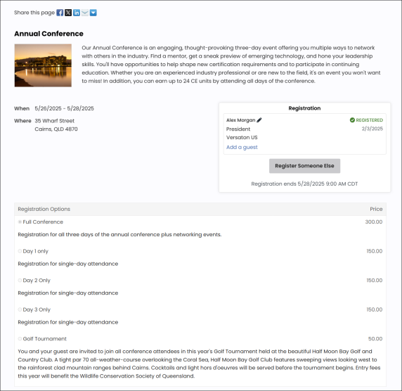 | Online events | Create online event pages or microsites to enable your constituents to register and access event details including locations, agenda, registrant directory, X (Twitter) feed, and more. |