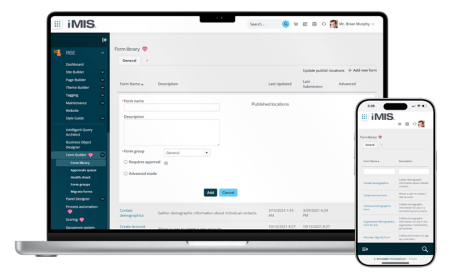 Forms helps you design and deploy beautiful and functional forms that drive value for your staff and constituents. Forms can combine information from multiple iMIS data sources while enforcing complex business rules to ensure that your data is captured correctly and completely while leading your constituents on the journeys that you have planned for them.