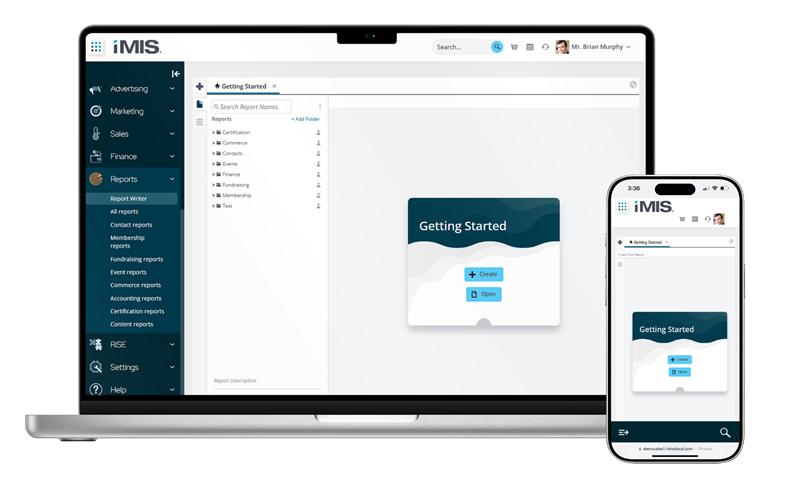 The iMIS Report Writer is a web-based drag-and-drop report designer and interactive report viewer embedded within iMIS. The Report Writer offers secure access to iMIS data sources such as business objects and IQA queries. It also offers complex reporting features, visualizations and dashboards.