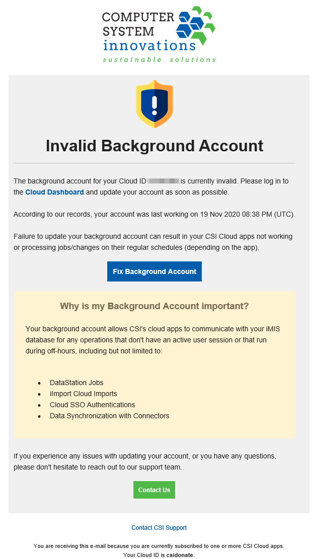 - Update your Background Account in the CSI Cloud Dashboard (see above).