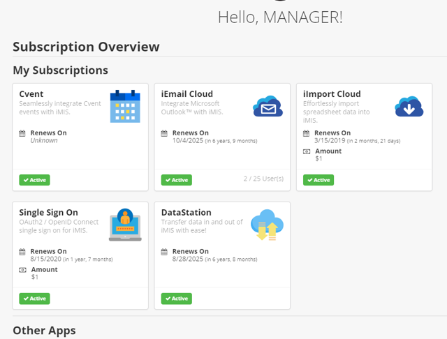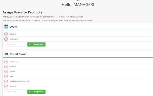 On this page, the client admin has the ability to add or remove iMIS user access to each cloud app that has been purchased and/or licensed for. Some apps may be limited by the number of users assigned at a given time because of the licensing subscription.
