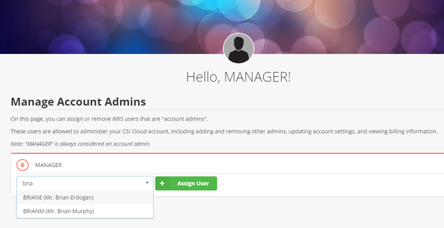 The client admin is allowed to assign or remove iMIS users that are “account admins”. These users would be allowed to administer the CSI Cloud account, which includes updating account settings, viewing billing info, etc.