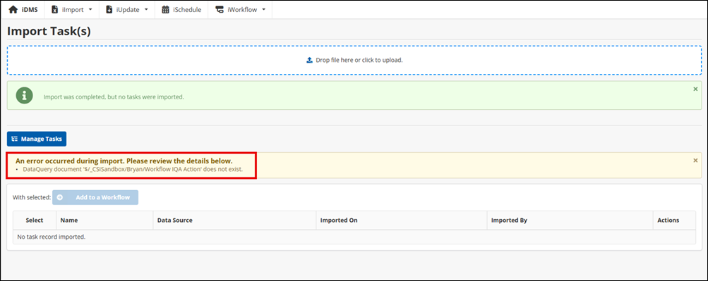 If unsuccessful, the error message appears. You will need to ensure that the IQA exists in iMIS and retry the import.