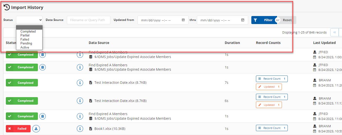 - Partial Imports - Jobs that had both successful completions and issues with some records while running.