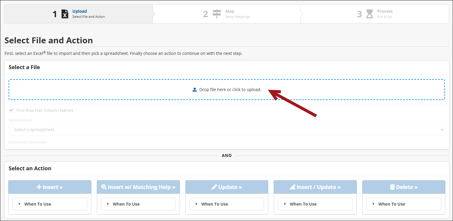 Utilizing iImport begins by uploading the spreadsheet that will be used to insert and/or update data. Do the following to upload a new file: