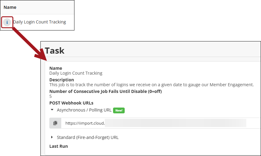 To view webhook or trigger information for a task, click the information icon next to the task Name. Webhook information can be found under the POST Webhook URLs header.