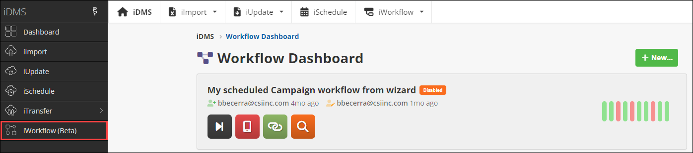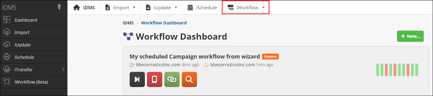 To browse all of your iDMS iWorkflow workflows, use the side navigation – under iDMS, select iWorkflow.If you are already in another iDMS product, you can also use the top menu - select iWorkflow > Dashboard.