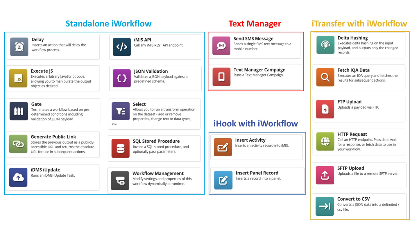 iWorkflow is a standalone module that serves as a prerequisite for both iHook and iTransfer. While it can also be used alongside Text Manager, it is only required if one-off text messages need to be sent. The chart below outlines the functionality provided by iWorkflow and its related modules.