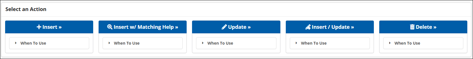 The five different options determine how the spreadsheet (iImport Cloud) or IQA query (iUpdate Cloud) will modify your iMIS database.