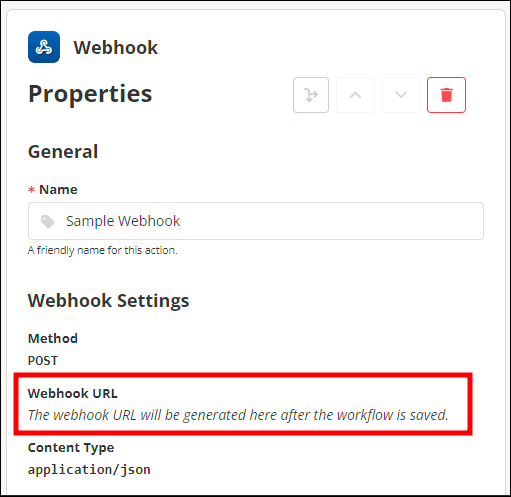 When you first add the Webhook trigger to a workflow, you will see the following message in the properties pane: