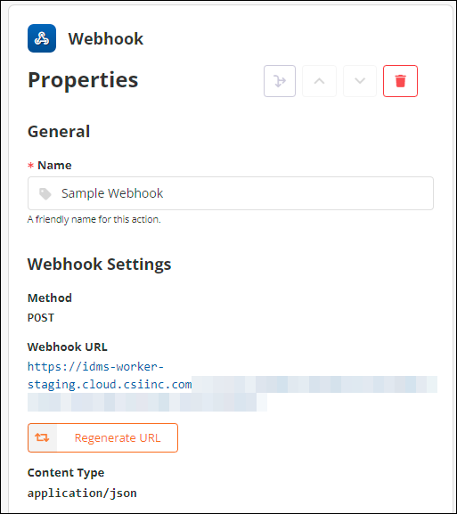 If you believe that your URL has been compromised, or you would otherwise like to regenerate your random webhook URL, you can click [ Regenerate URL ] in the properties pane of the webhook trigger.