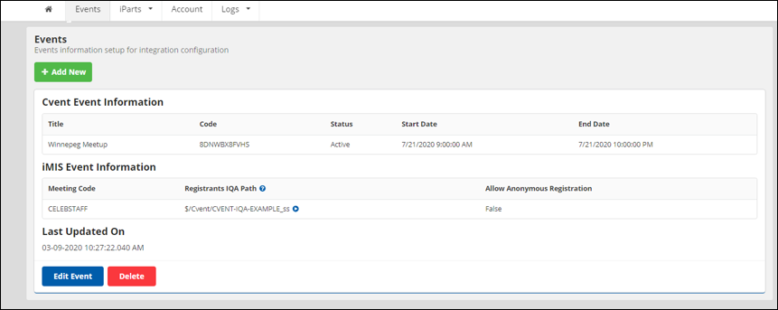 The Events page allows you to add or edit events, provided they are setup in Cvent.