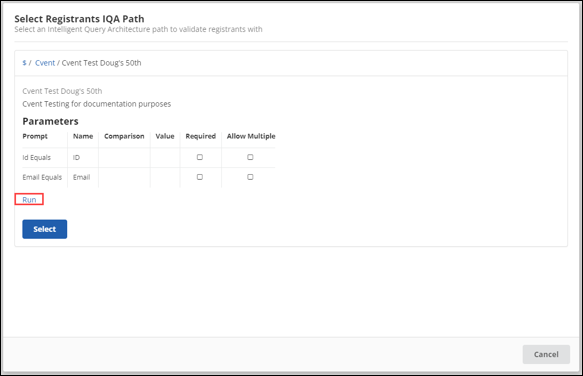 This IQA path can be checked by navigating to CSI Cloud Cvent application > Events > [specific event] > Registrant IQA Path. If the member is allowed to register, the IQA query should return one result when the member’s information is entered into it.