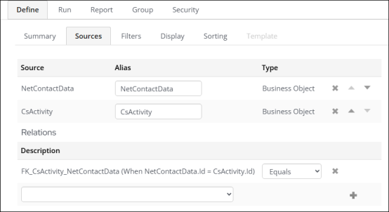 - (Sources tab) Add the NetContactData and CsActivity sources with the following join: NetContactData.Id = CsActivity.Id