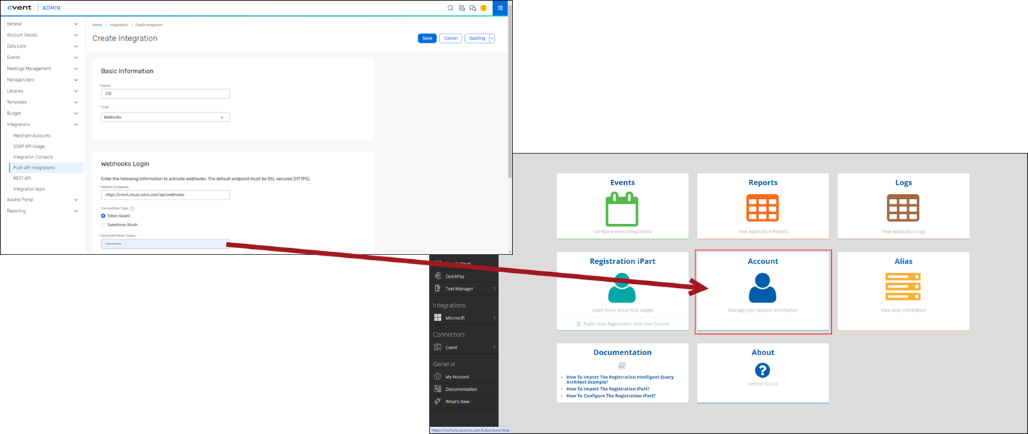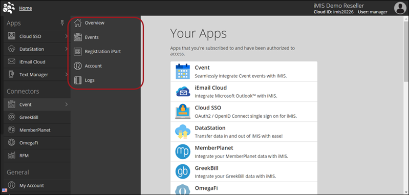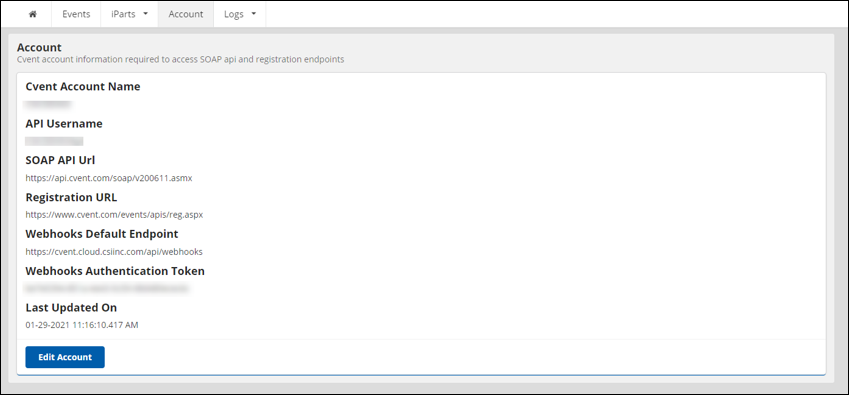 - If you click on Cvent via the side banner, you will be presented with a sub-menu (Overview, Events, Registration iPart, Account, Logs). Overview is most common. If you are setting up your account, click Account.