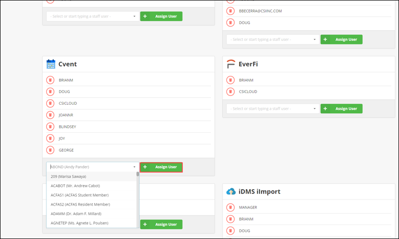 - Under Cvent, add the desired user (possibly yourself) and select Assign User.