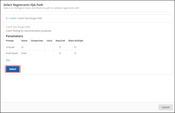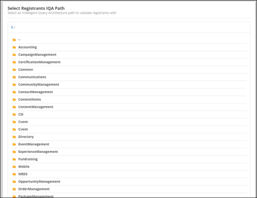 - Registrants IQA Path: This allows you to specify the iMIS IQA for the list of registrants allowed to register for this meeting. You must have an IQA that matches the result set for Cvent Standard Service. A SELECT button is also active for this data point and is recommended.