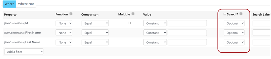 - (Filters tab) Add the following filters, all with In Search? set to Optional:
