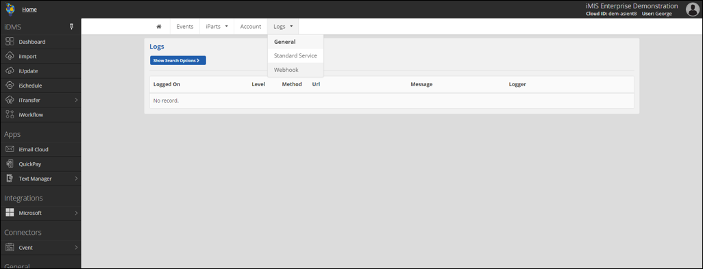 In the CSI Cloud Cvent application, navigate to Overview > Logs, then use the banner to select Webhook.