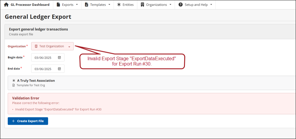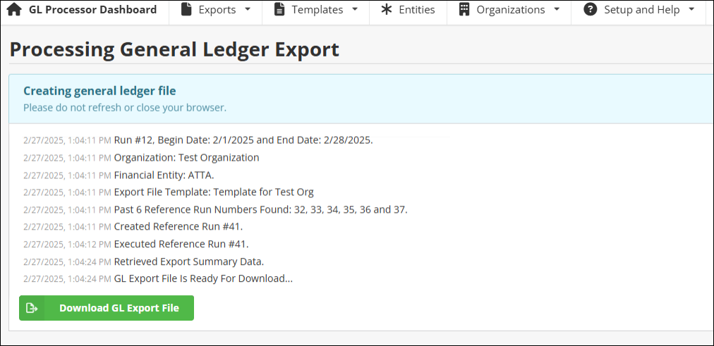 Once the export process has completed, the generated file can be downloaded by clicking Download GL Export File.