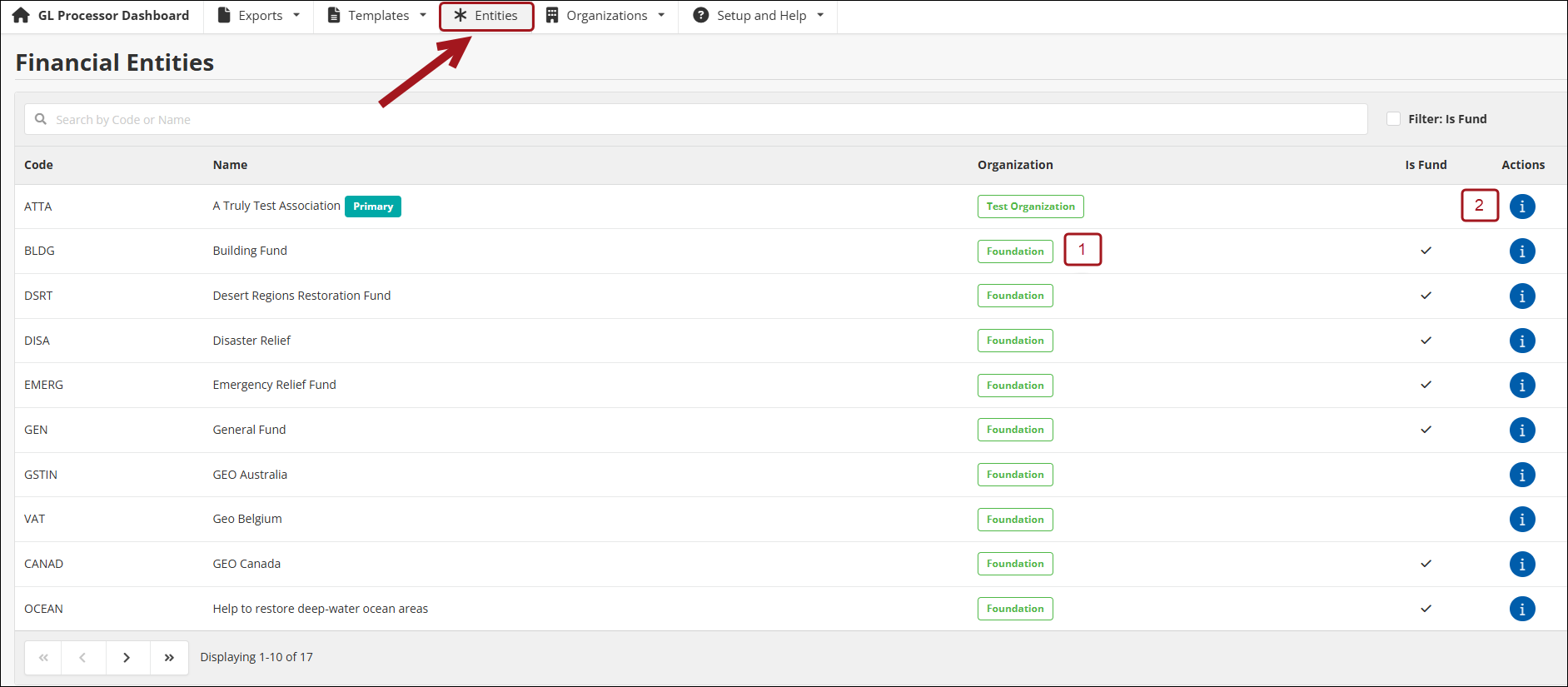 To view the financial entities, go to theGL Processor dashboard and select Entities from the top navigation bar.