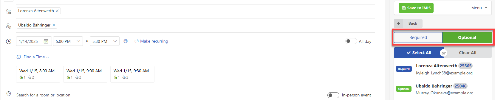 When viewing search results or contact lists in iMIS Outlook Integration, users can add an attendee as Required or Optional using top level filter (highlighted in red). Click on Required or Optional, then select the corresponding attendees. Unchecking the attendees will remove them from the list.