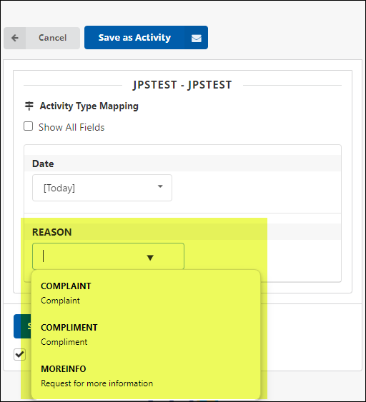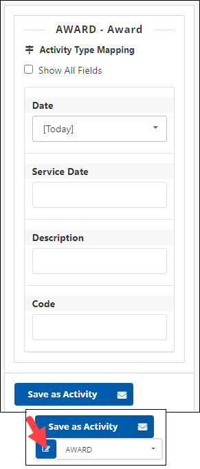 - Email Activity - By clicking the Save as Activity button, an Activity record is written for each valid contact displayed on screen. Instead of selecting the Save as Activity button, click on the icon next to the name of the Activity to change the default fields that are setup in Options > Setup Activity Types.