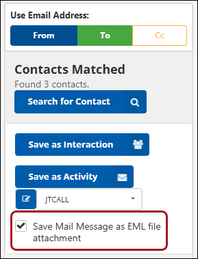 An EML file contains the content of the message, along with the subject, sender, recipient(s), and date of the message. EML files may also store one or more email attachments, which are files sent with the message. When Save Mail Message as EML file attachment is enabled, if an Interaction or Activity is saved, the email is saved as an attached .EML file.