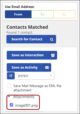 If the email contains attachments, the Attachments section will appear collapsed just below the Save Mail Message as EML file attachment checkbox. Clicking on the arrow or the Attachments title will expand the section and display all attachments selected within the email. Exclude specific attachments from being saved to iMIS by unselecting them before clicking the Save as Interaction or Save as Activity buttons.