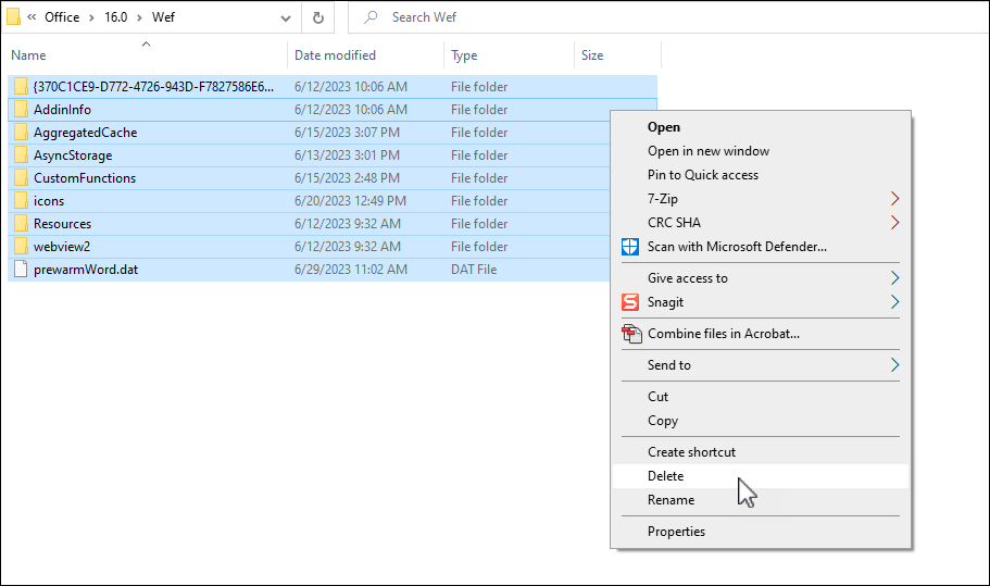 %LOCALAPPDATA%\Microsoft\Office\16.0\Wef(replace16.0with the version of Outlook that is installed) and press Enter. - Select all the files and folders inside the Wef folder and delete them.
