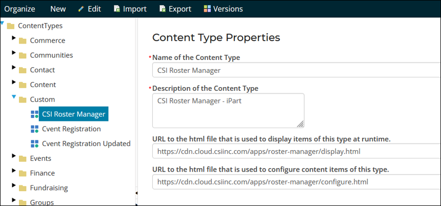- URL to the html file that is used to configure content items of this type - https://cdn.cloud.csiinc.com/apps/roster-manager/configure.html