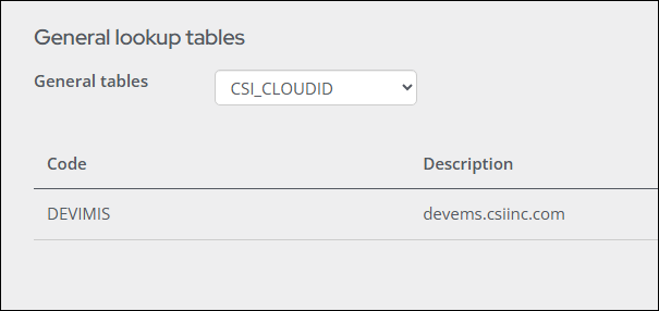 Note: If you have multiple domain names that need to refer to the same CSI Cloud ID instance, you can add another general lookup entry in the CSI_CLOUDID table and use the Expansion field to store the CSI Cloud ID. In this case the Code value will be discarded, and the Expansion value will be substituted instead. For example: