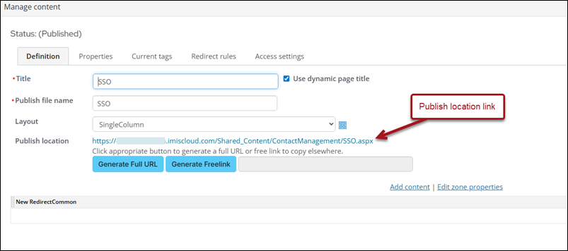 Next, you need to create a RiSE page with the Single Sign On content item on it. See Adding the client-application redirect to a page.