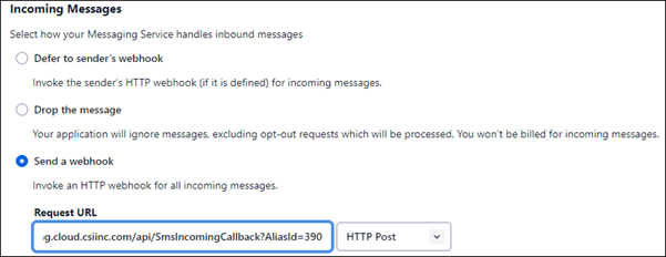 - Enter the following URL with the correct Alias ID instead of "123": https://textmanager-fn.cloud.csiinc.com/api/SmsIncomingCallback?AliasId=123