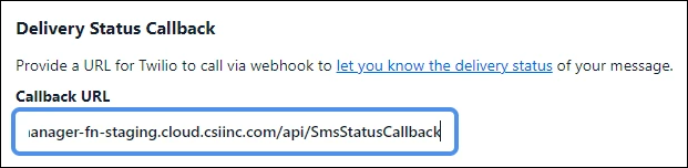- Under Delivery Status Callback, enter the following URL: https://textmanager-fn.cloud.csiinc.com/api/SmsStatusCallback