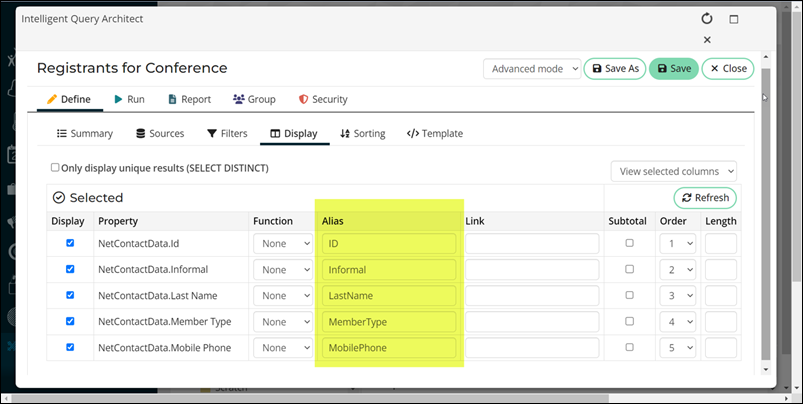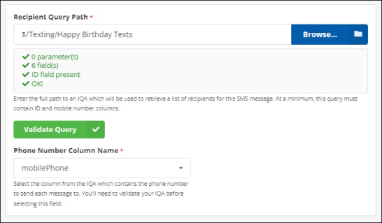 Important! The IQA must have at least two fields (iMIS ID and Mobile Phone number). All columns must have the Alias field populated within the IQA.