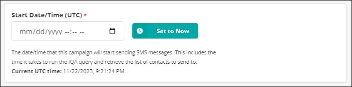 - From the Start Date/Time (UTC) field, choose the start date and time for the campaign. This includes the time it takes to run the query and retrieve the list of contacts.