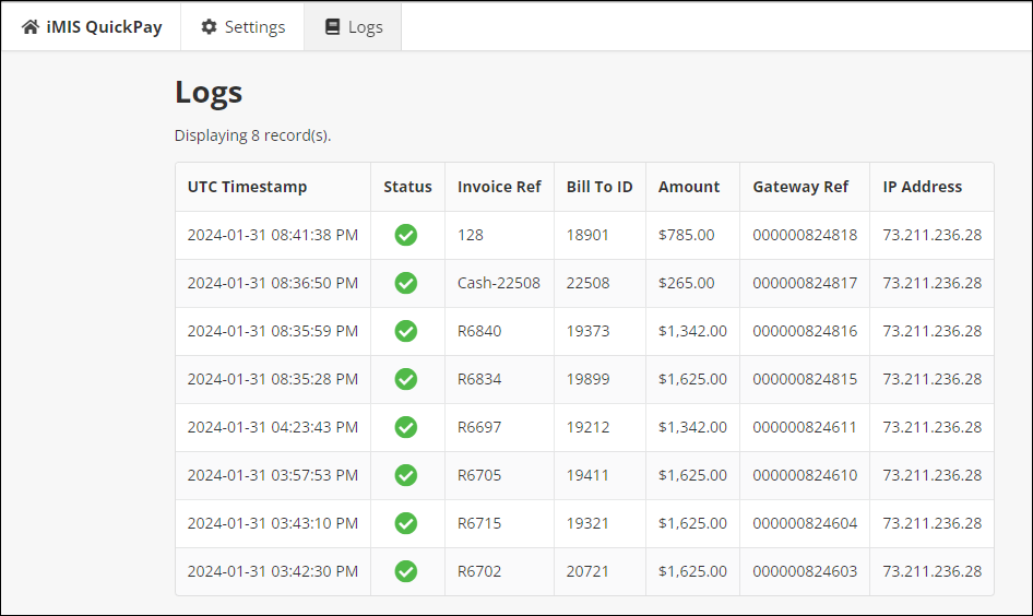 - The log table shows only payments that were successfully processed by iMIS Pay and transmitted to our servers for final processing. Failed payment attempts—such as those due to insufficient funds, fraud declines, or deactivated credit cards—are not recorded in this table. If a payment issue occurs and no log entry appears in the QuickPay dashboard, contact ASI for assistance.