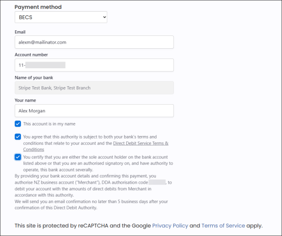 Create the direct debit payment method and associate it with your Stripe gateway. Add it to the appropriate payment method sets for staff and public users. See Setting up NZ BECS for additional information.