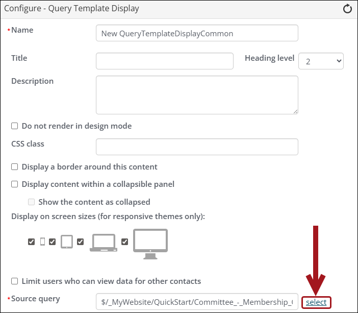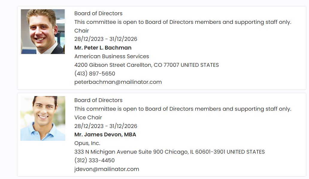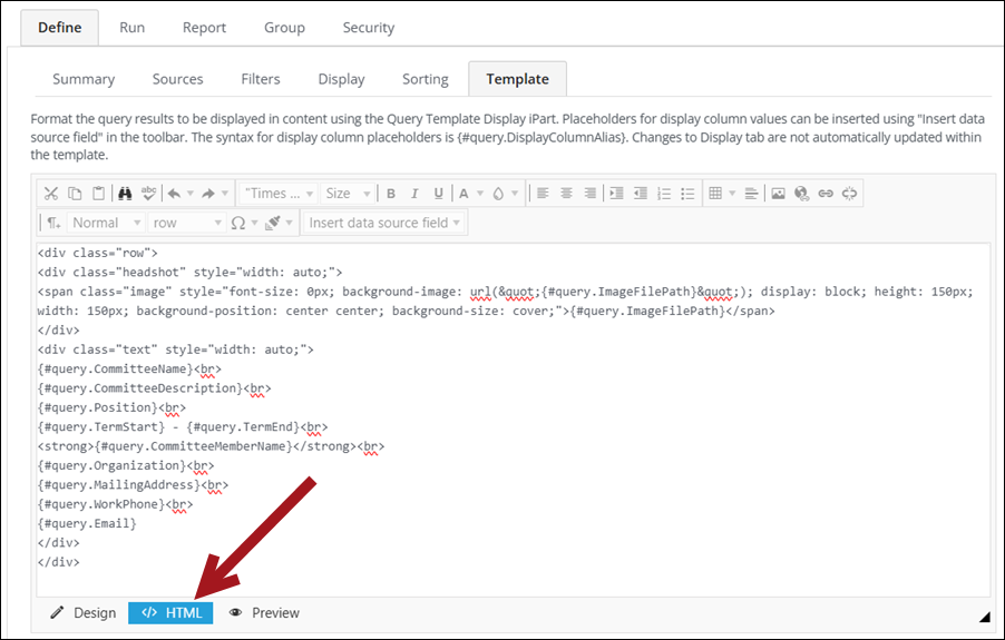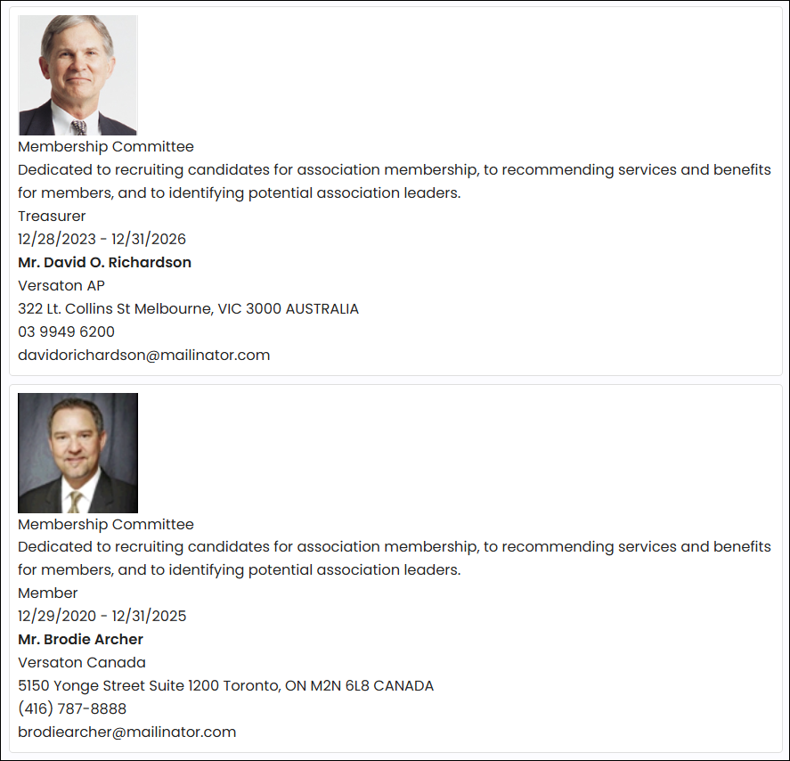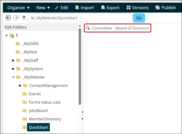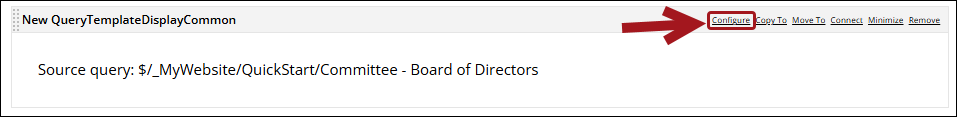 The Board Committee Roster content record uses the Board Query Template Dynamic Content Item to display the members of the Committee. The data and the template are defined in the Committee - Board of Directors IQA query, located at $/_MyWebsite/QuickStart/Committee - Board of Directors.